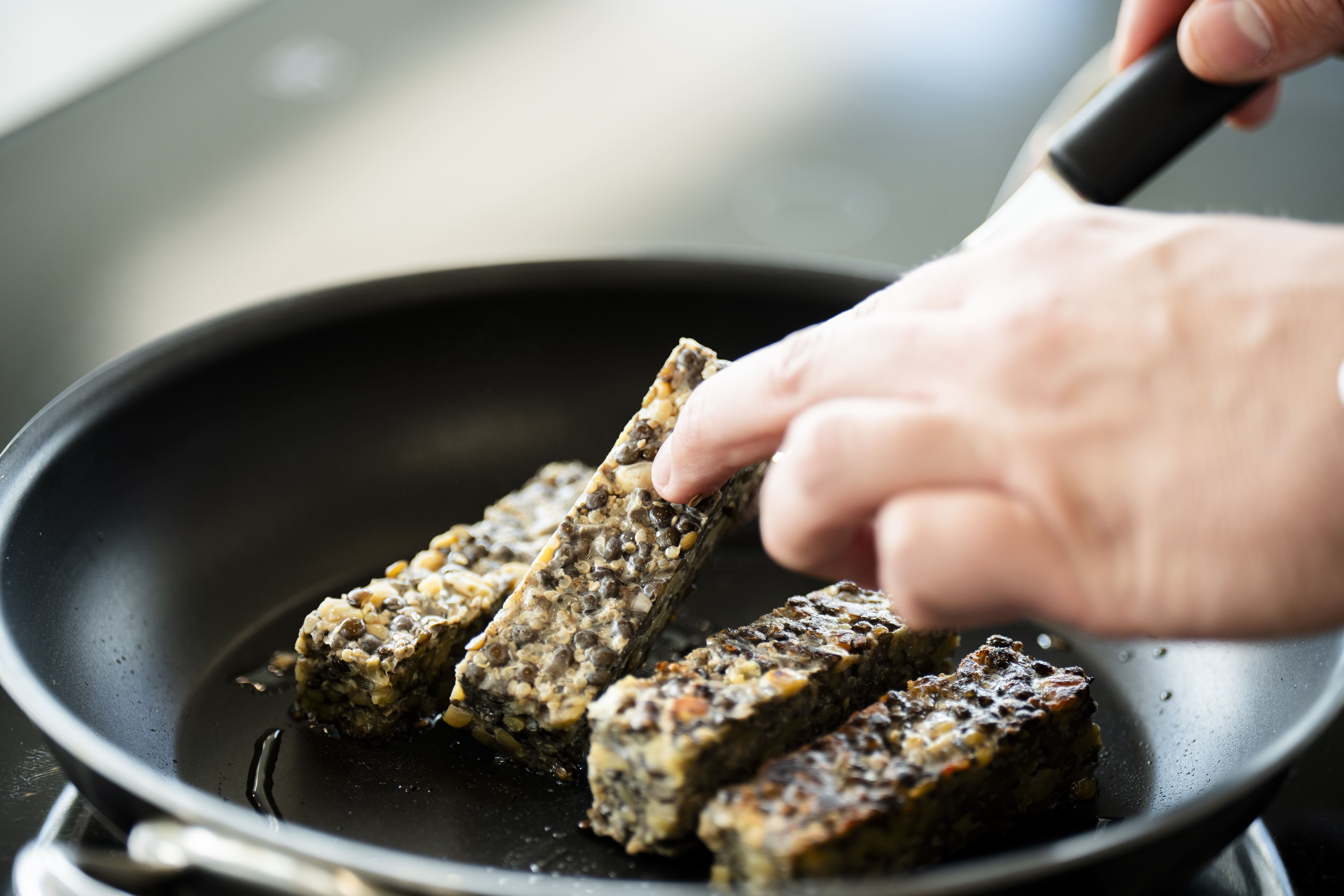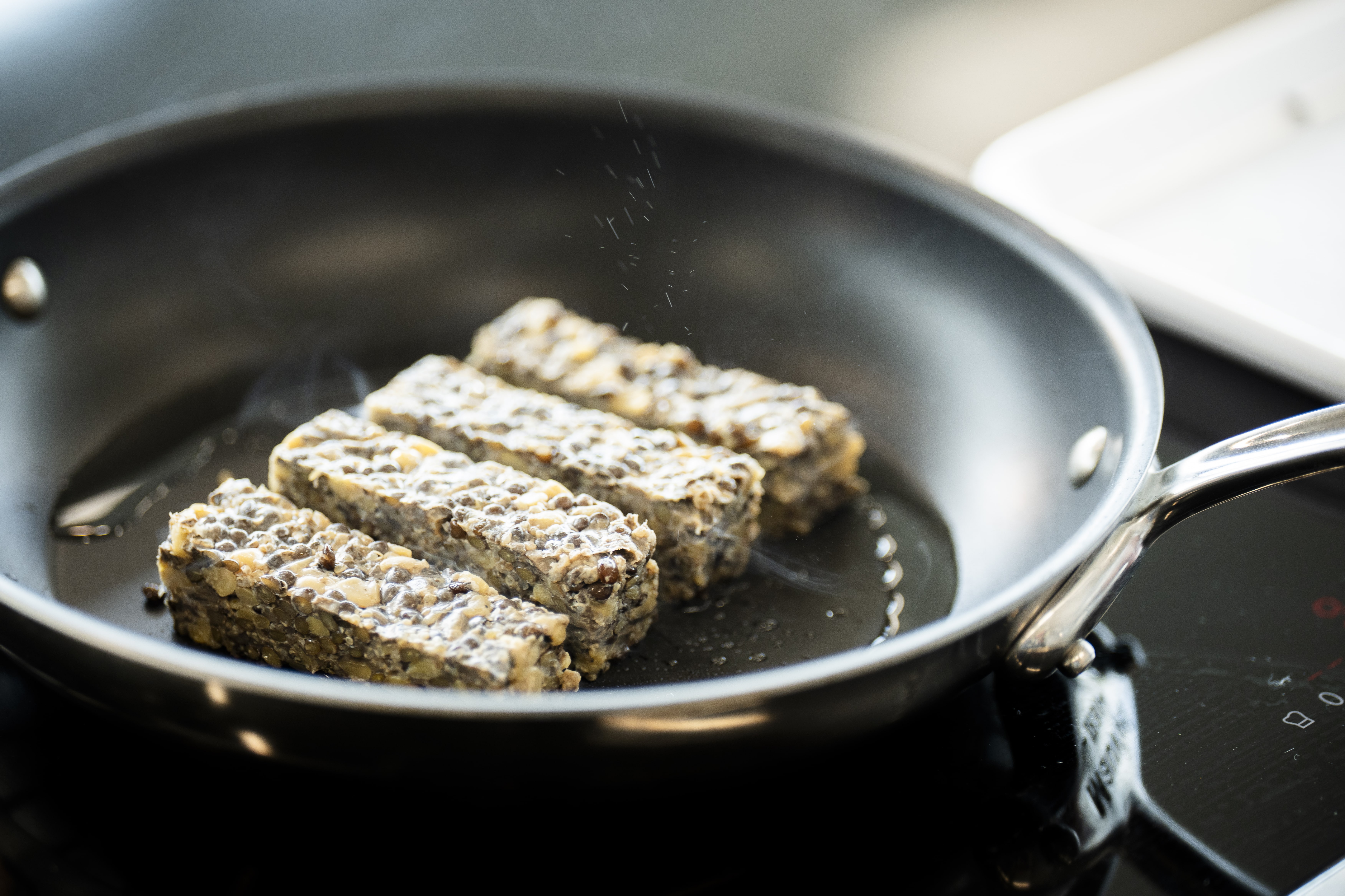 Cut Yumame into the desired shape. Preheat the pan with oil over medium to high heat and add the Yumame pieces. Depending on the desired texture and color, fry for about 2–3 minutes on each side.